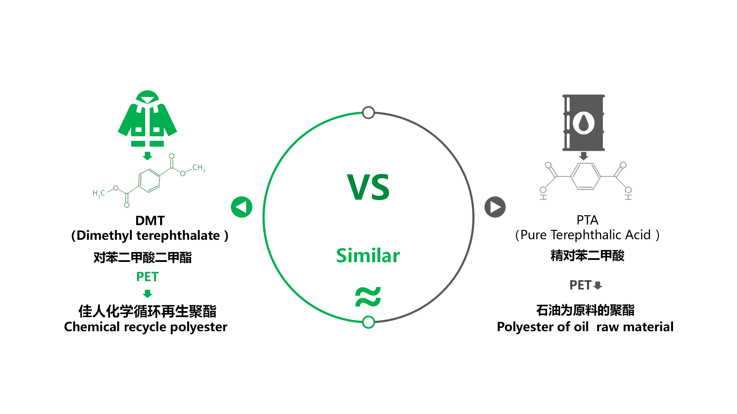 Polyester regeneration mainly consists of three technologies, the original one is petroleum - naphtha - PX-PTA-polyester, the physical method is to use waste polyester bottle - cleaning - melting extrusion - polyester regeneration, the chemical method is to use waste textile - depolymerization - regeneration DMT- polymerization - polyester regeneration. The regenerated products of Jiaren currently include following categories: half light, light, full extinction, cationic, antimony free, high&low stick chips, FDY,POY,DTY and other polyester filament, the quality is the same as the original products.